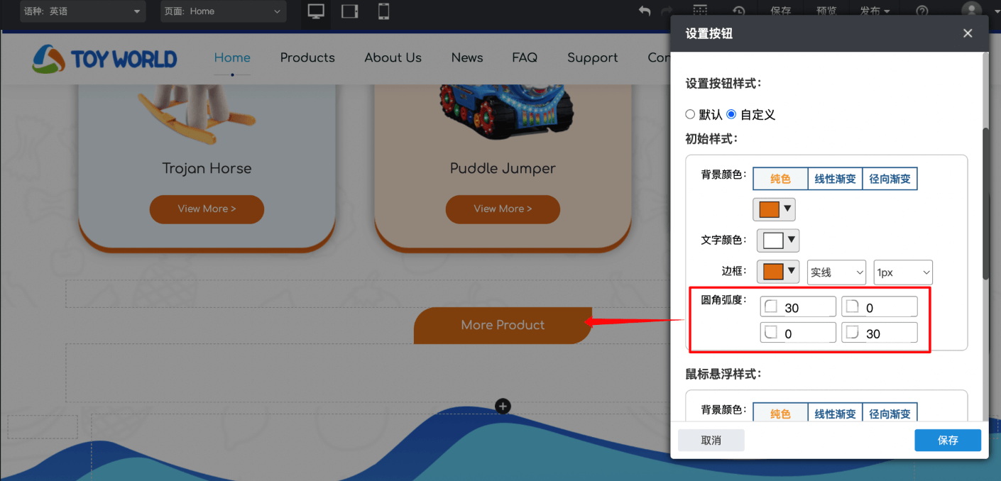 发布功能:打开按钮组件设置弹窗,选择“风格”页签,可自定义编辑在初始样式和悬停样式下按钮的圆角弧度,支持分别设置四个圆角的弧度。