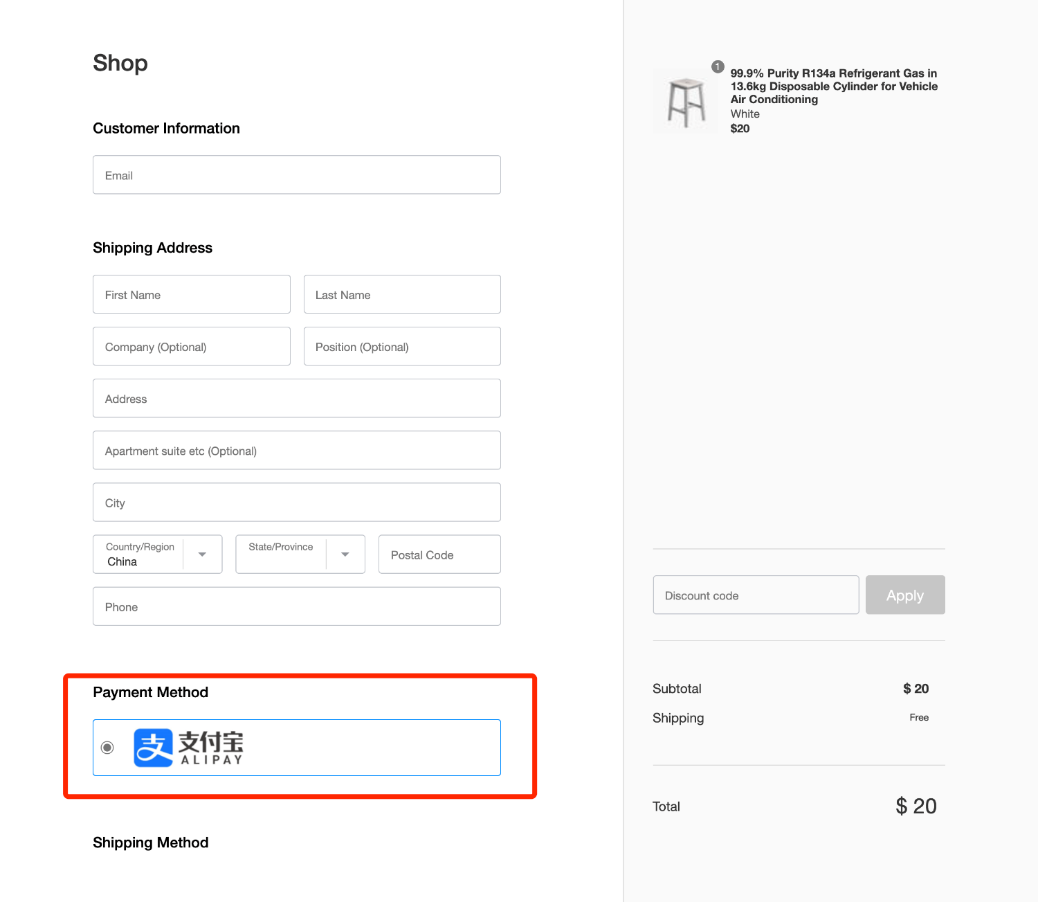 (3)当新支付方式启用后,在商场下单页面,“支付方式”模块中会显示“支付宝”选项,客户填写商品收货信息后,可选择“支付宝”支付来完成订单提交。