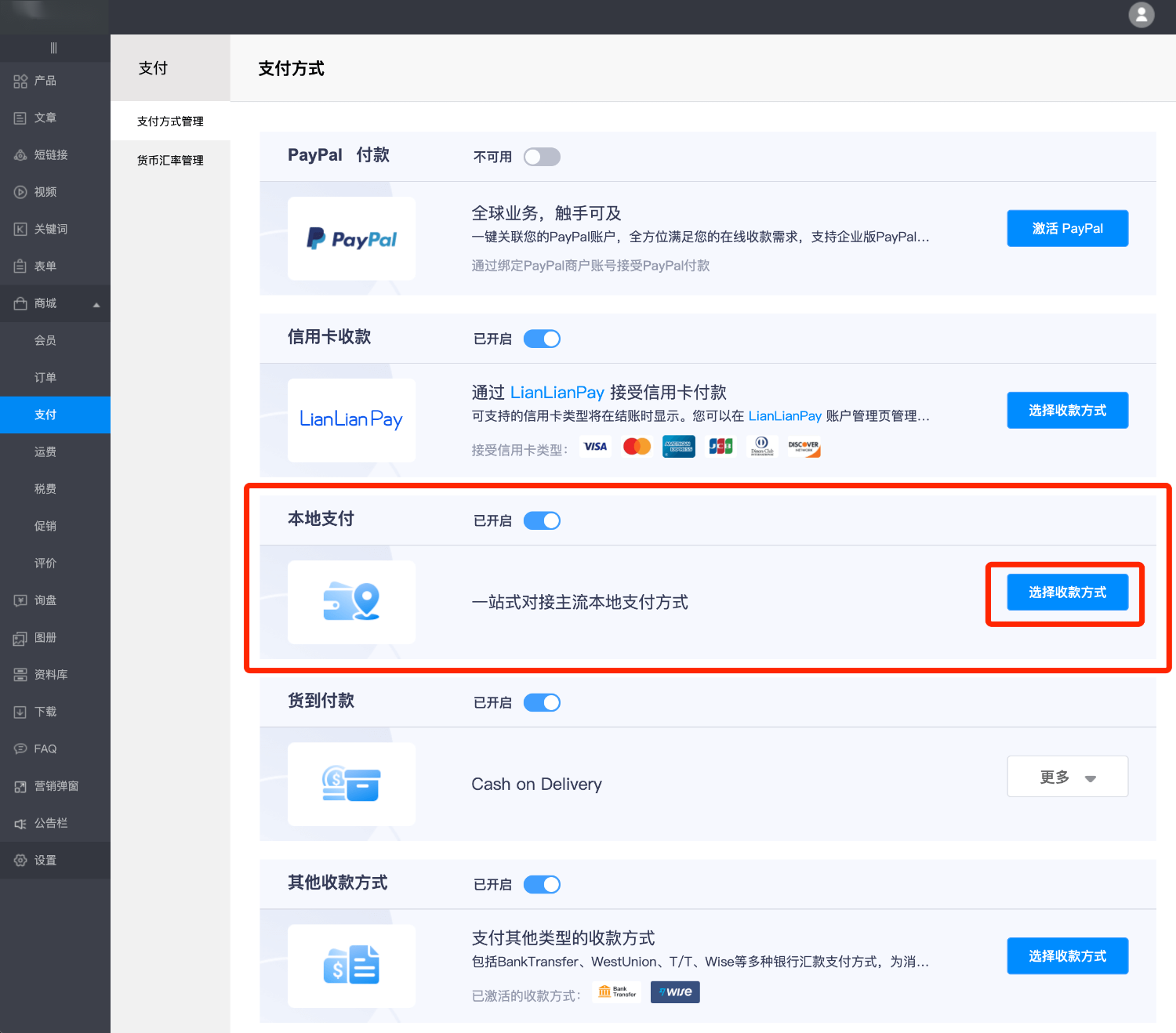 (1)在“内容管理后台”—“商场”—“支付”导航项下,“支付方式管理”页新增“本地支付”选项;
