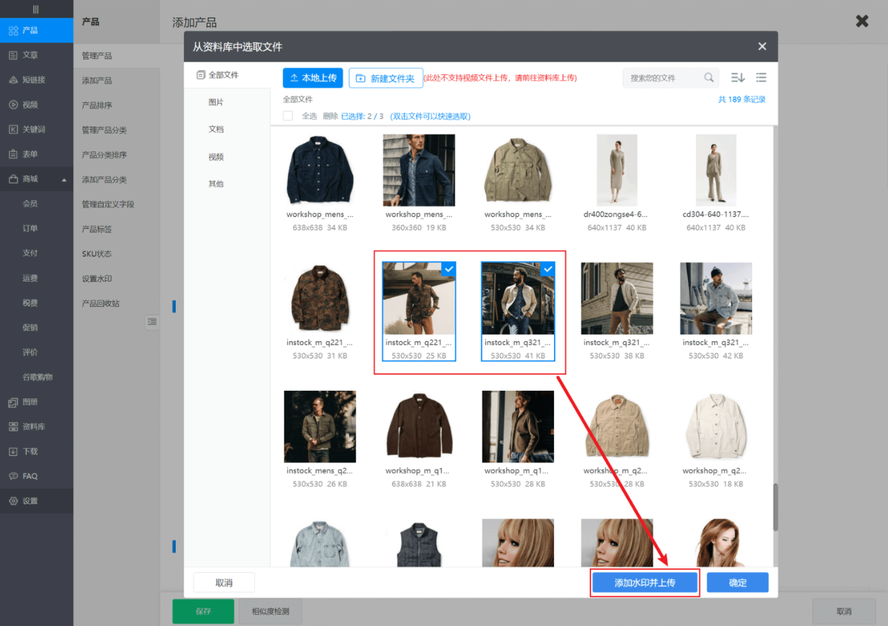(2)在资料库弹窗中,新增“添加水印并上传”按钮。勾选图片后点击按钮,可按照后台设置好的内容为图片加上水印,并直接将增加水印的图片上传至网页或后台中。