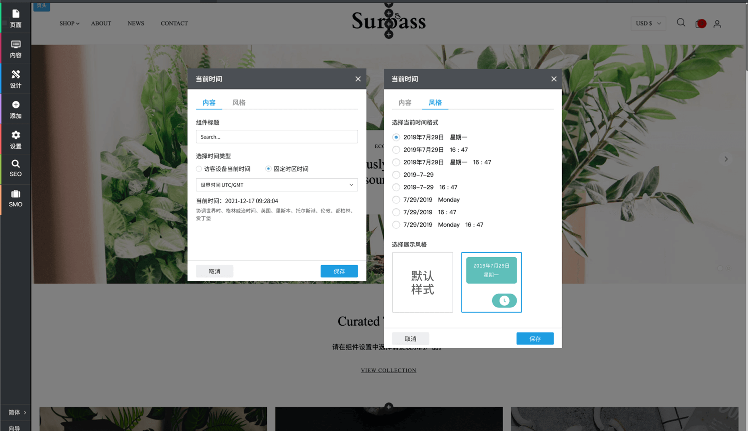 2、“当前时间”组件新增展示风格2,新增“展示固定时区时间”功能
