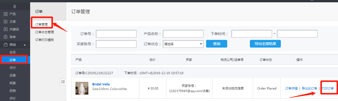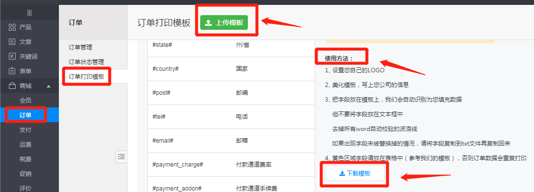 第1步:点击进入“内容管理后台→订单→订单打印模板”,如下图所示: