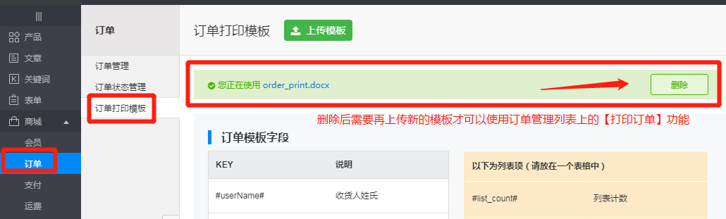 注意:当上传模板成功后,“订单打印模板”界面上会出现如下红色框标注的一行提示,显示“您正在使用xxxx.docx”模板;可以执行【删除】操作,删除后需要再上传新的模板才可以在订单管理列表上出现【打印订单】的操作;如下图所示: