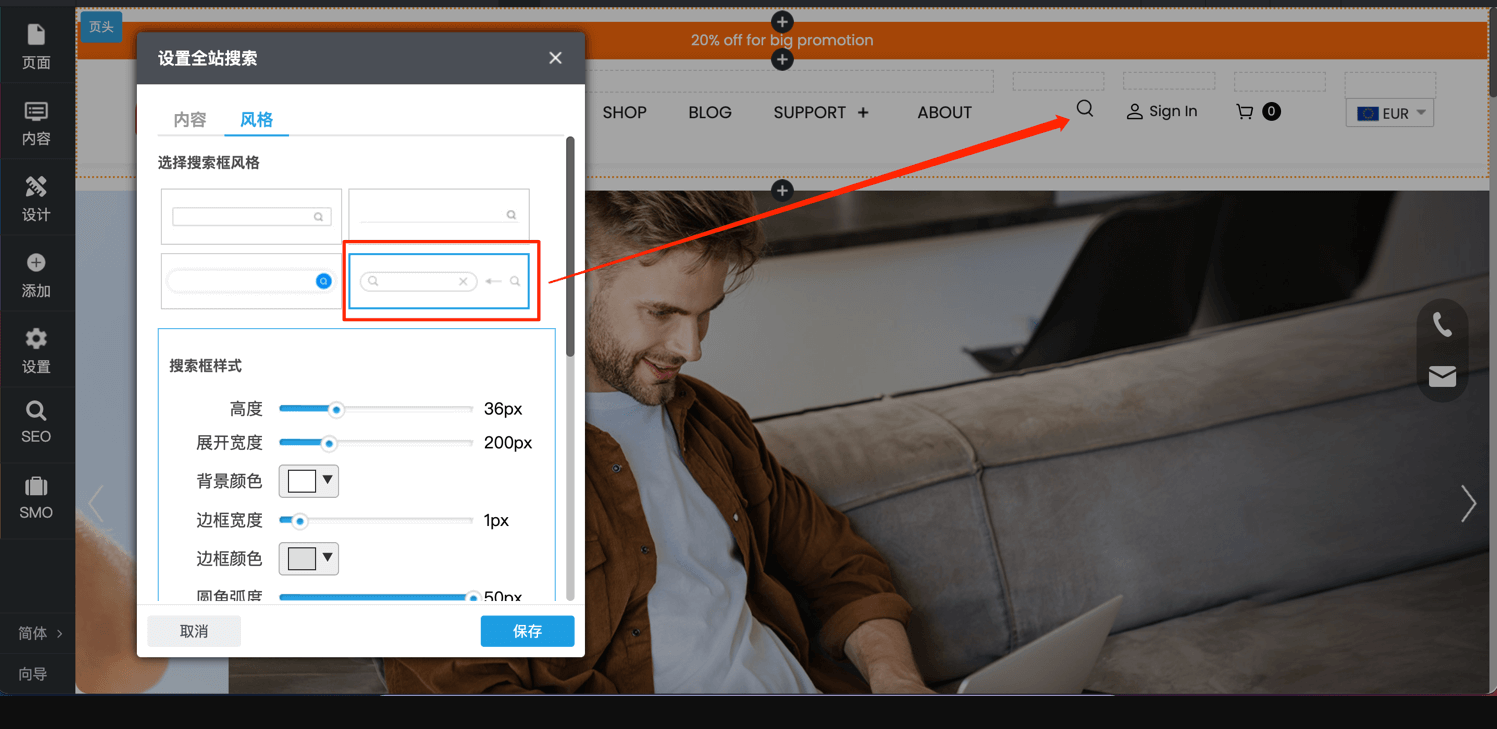 2、全站搜索组件增加新风格,支持点击搜索按钮后向左侧展开搜索框,满足网站页头紧凑型排版的需求。