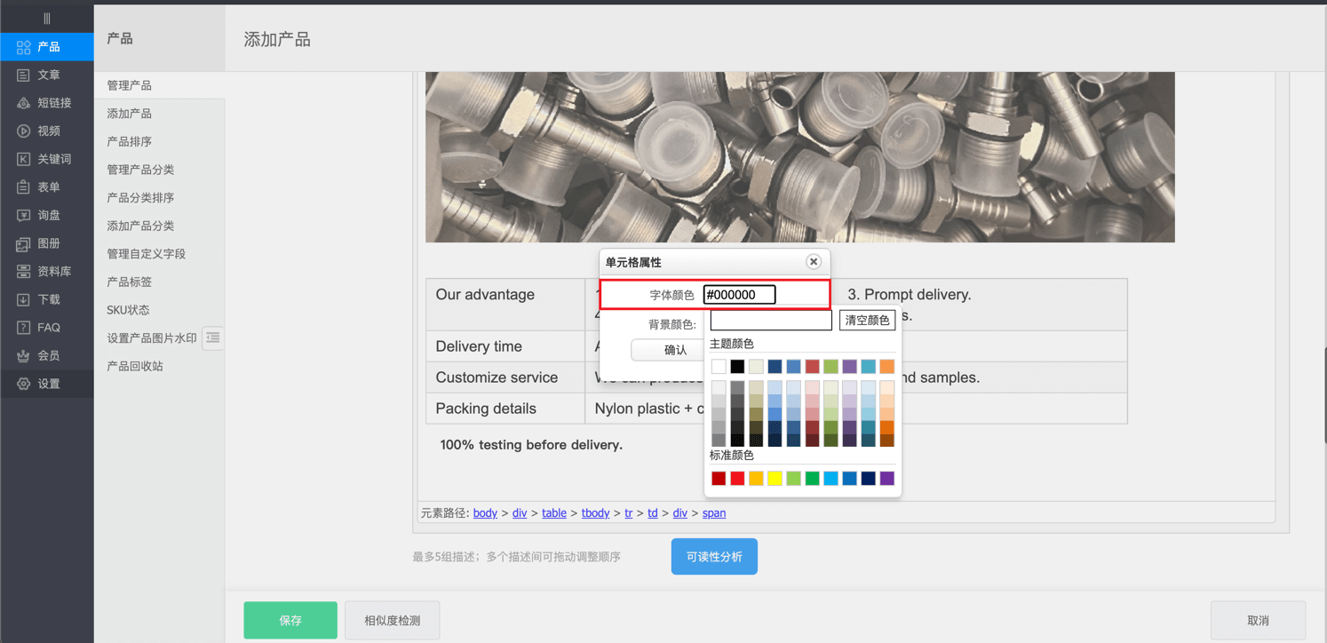 1、优化内容管理后台-产品描述富文本编辑器,新增批量修改表格文字颜色功能;