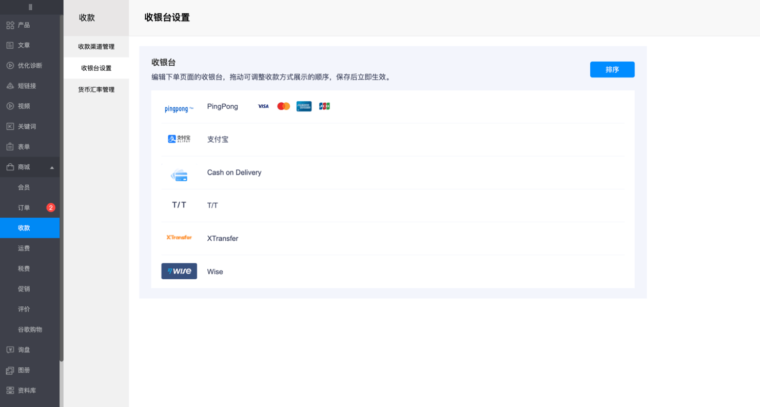 步骤一:在内容管理后台-收款-收银台设置页面,点击“排序”按钮,拖动支付方式选项,调整顺序后保存;