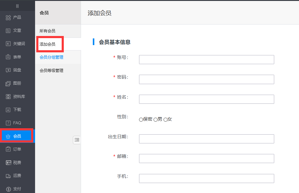 手动添加:客户自己在内容管理后台手动录入买家会员信息。录入入口:内容管理后台——会员——添加会员。如下图所示: