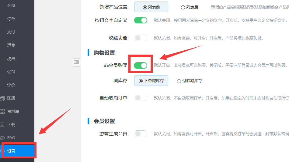 2、如卖家只希望会员角色可以购买,设置入口:内容管理后台——设置——购物设置——非会员购买,将绿色按钮关闭,关闭保存后非会员需要注册登录成为会员才可以购买。如下图所示: